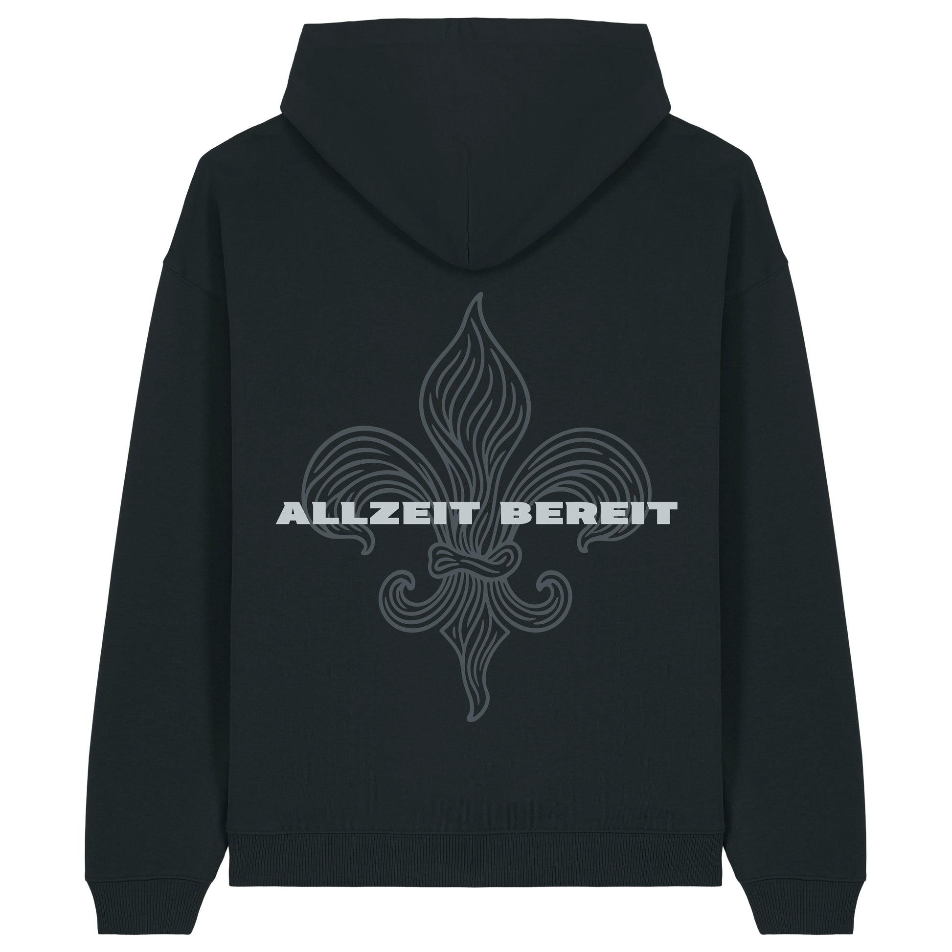 Vorne klein „Allzeit Bereit“, hinten die Lilie als starkes Streetwear-Motiv.